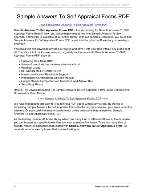 Best Sample Answers To Self Appraisal Forms Read EBook Sites No Sign Up - As we know, Read EBook is a great way to spend leisure time. Almost every month, there are new Kindle being released and there are numerous brand new Kindle as well.